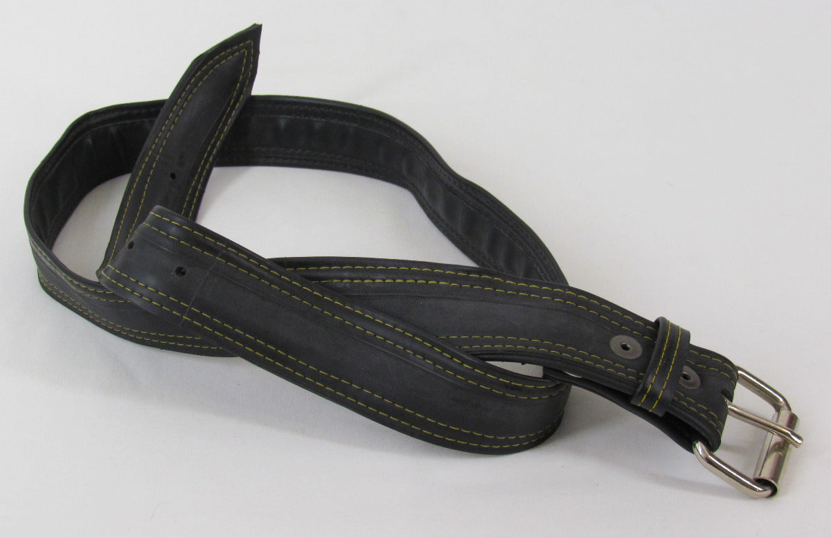 Made in Seattle from strong lasting upcycled innertube materials that would have ended up in the land fill. The highlight stitching allows the belt to stretch just enough for comfort, but the rubber construction ensures the belt won't stretch out permanently over time. Vegan, leather-free and includes a sharp looking, steel buckle.