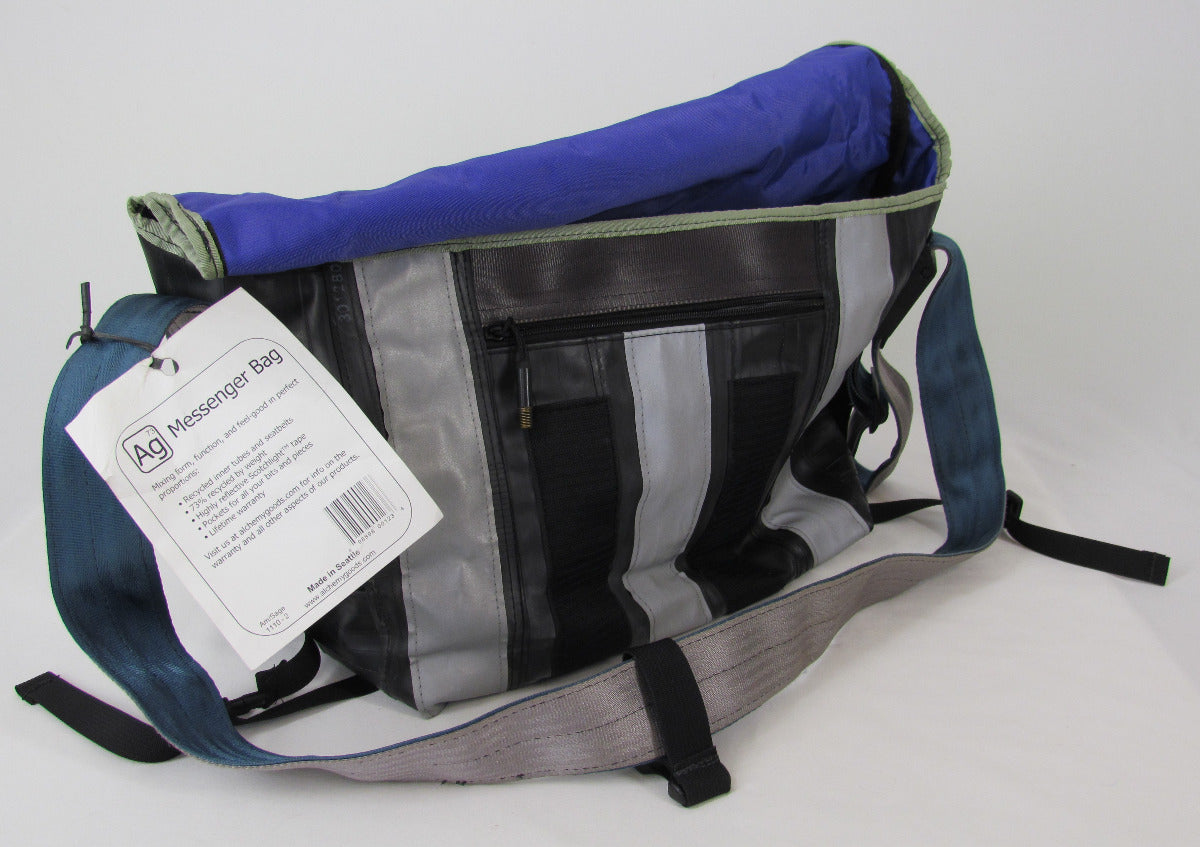 Made in Seattle, this bag is made from strong, lasting materials that would have ended up in the land fill; 73% recycled material: durable, cleaned & sealed recycled inner tubes; comfy shoulder strap made from recycled seat belt strap. New lining, water proof zipper, clips, velcro & reflective strips.
