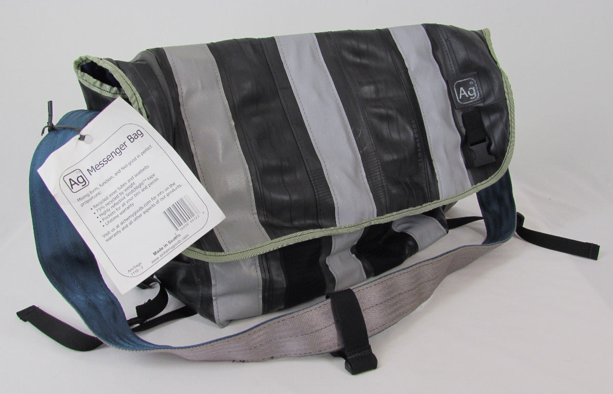 Alchemy Goods Large Messenger bag is made for the professional bike messenger from seam sealed recycled inner tubes (virtually water proof) and adjustable, recycled, seat belt shoulder strap with adjustable easy-click security strap. Large outer zippered pocket & two small outer side pockets. The lined (Amethyst) inside of the bag includes two large pockets to keep your records, three pen/pencil slots & easy access key clip. Sage green trim, three reflective strips surround your bag, velcro closures and secure, adjustable, easy-click buckles, and more!