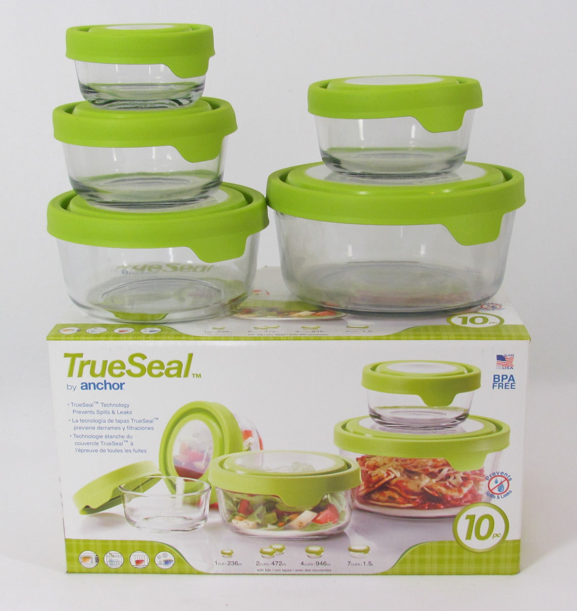 Made in USA. Tempered Glass is oven, microwave, freezer safe. Lids are BpA-free. Containers nest. TrueSeal lid technology prevents spills and leaks.