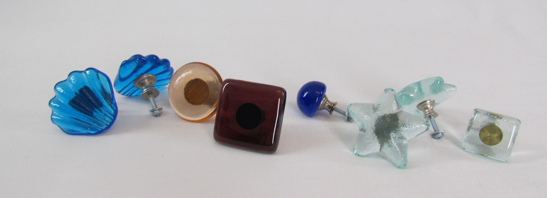 If you have a project that needs only one or two drawer pulls, or if you want to mix and match a variety of designs, these are lovely drawer pulls made from 100% recycled glass with 5/8” deep brass mounting.