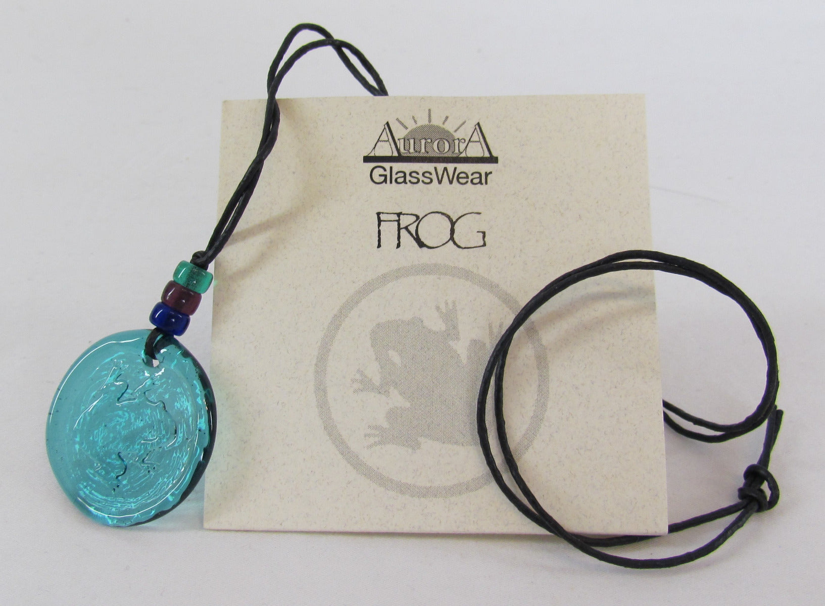 Aurora GlassWear Pendant Necklace has 1-1'4" diameter teal, recycled glass, pendant with embossed Frog & 3 glass beads on a leather necklace.