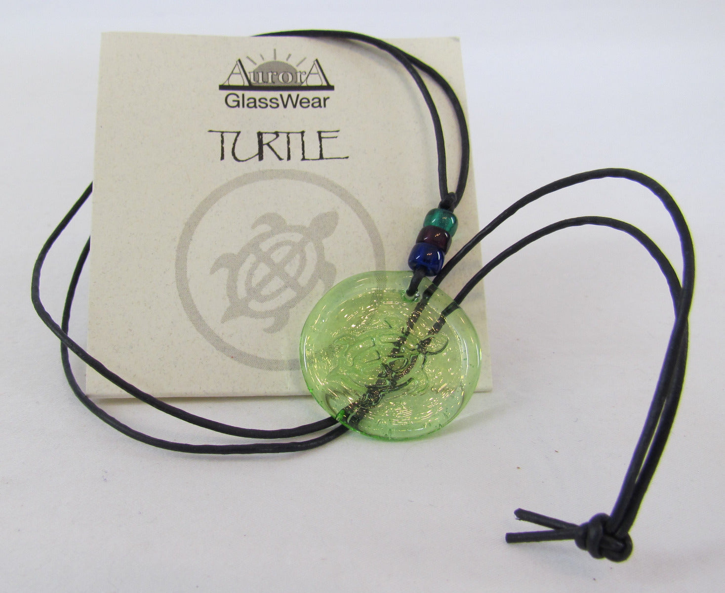 Aurora GlassWear Pendant Necklace has 1-1'4" diameter lime green, recycled glass, pendant with embossed Turtle & 3 glass beads on a leather necklace.