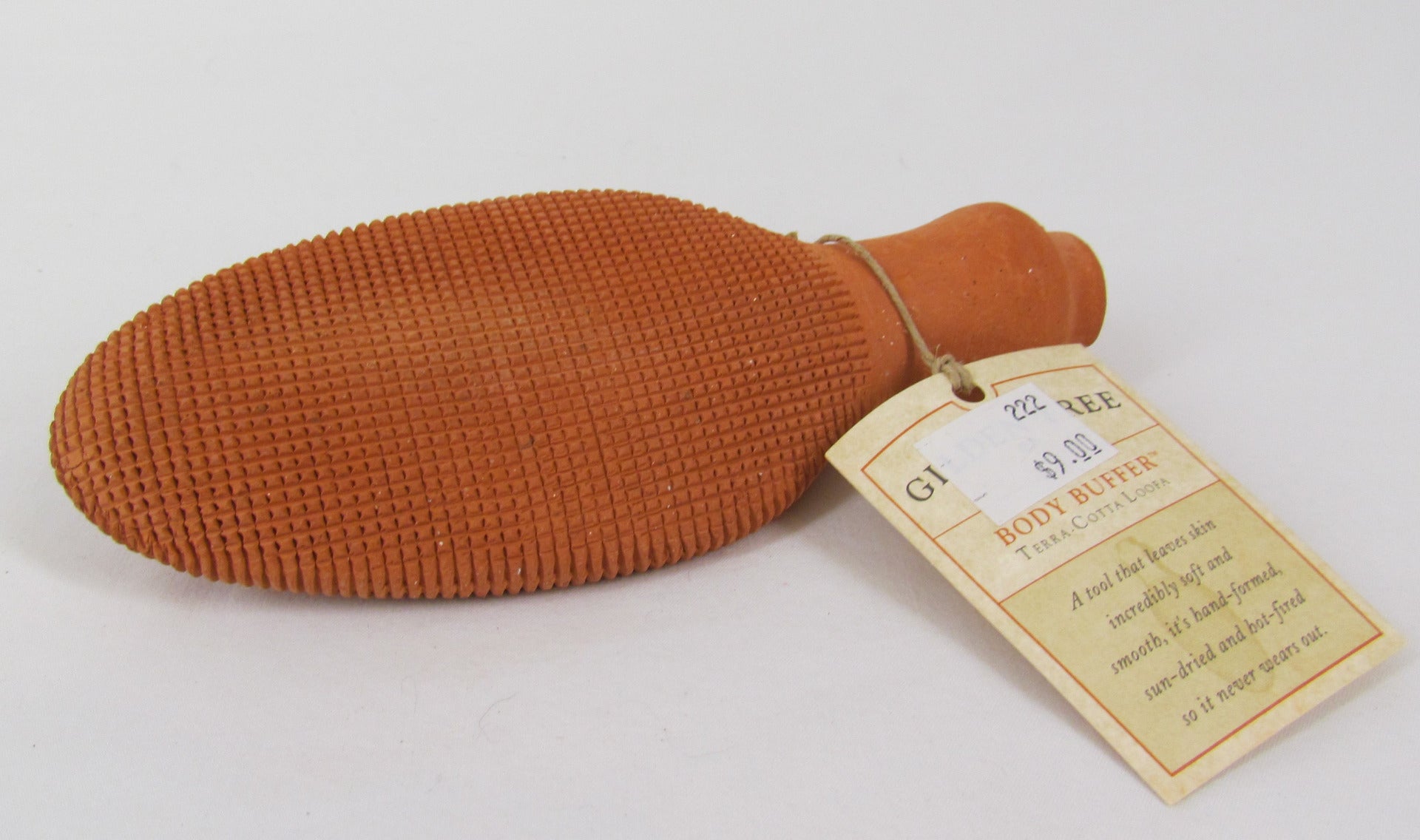 Hand-formed by cottage industry artisan women in Pakistan, Gilden Tree's Body Buffer is made of terra-cotta, sun-dried and kiln-fired so it won't wear out, disintegrate or get moldy like other pumice stones do.