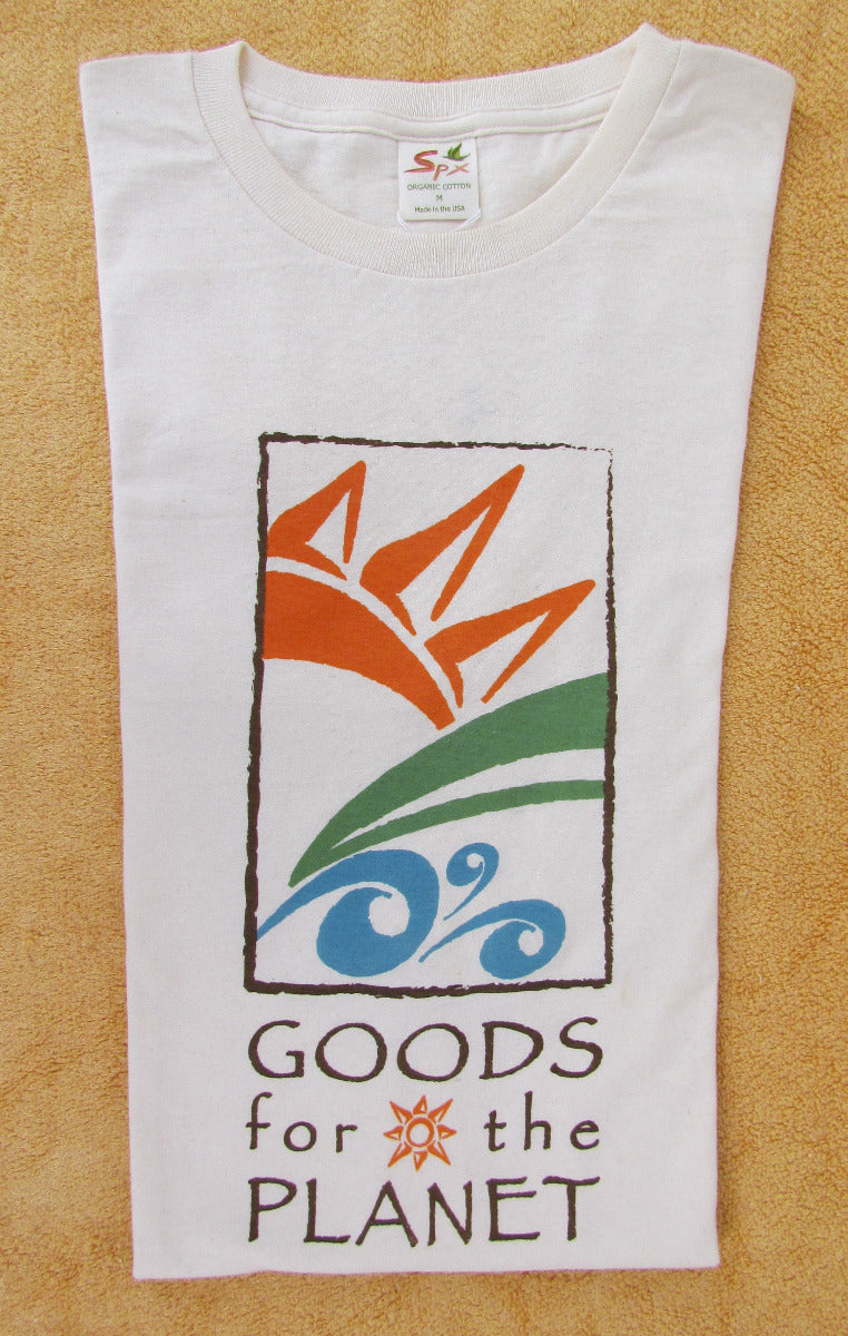 Goods for the Planet T-Shirt, natural 100% organic cotton, low impact dyes display our unique company logo, made in the USA