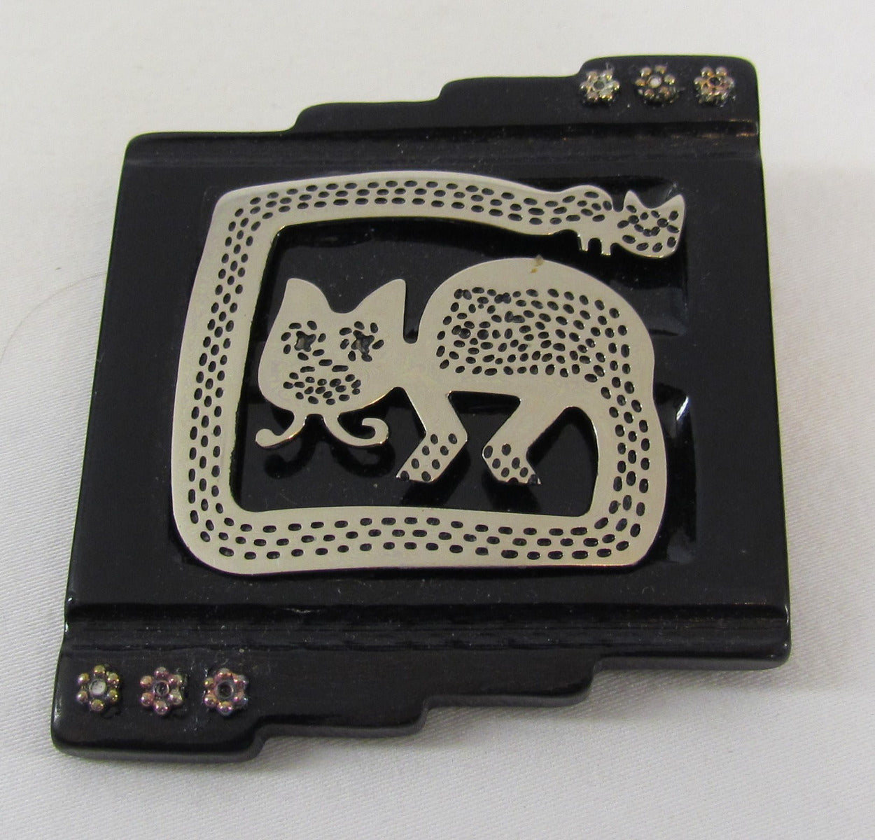 Michael Baehr Jewelry Brooch/Pendant-Cat. What may have once been a buckle creates a wonderful backing for a whimsical cat and tiny flower beads.