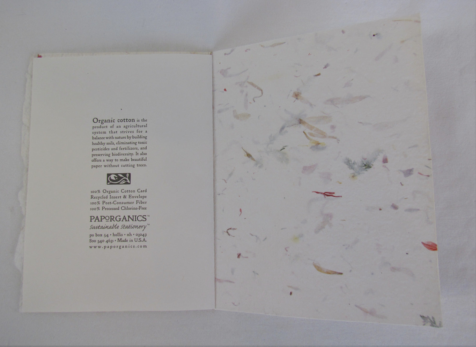Paporganics Greeting Cards are lovingly, and sustainably, handmade with 100% Organic Cotton Card Stock embedded with tiny pieces of plants, be it blossoms, hulls, leaves or other unique fibers.