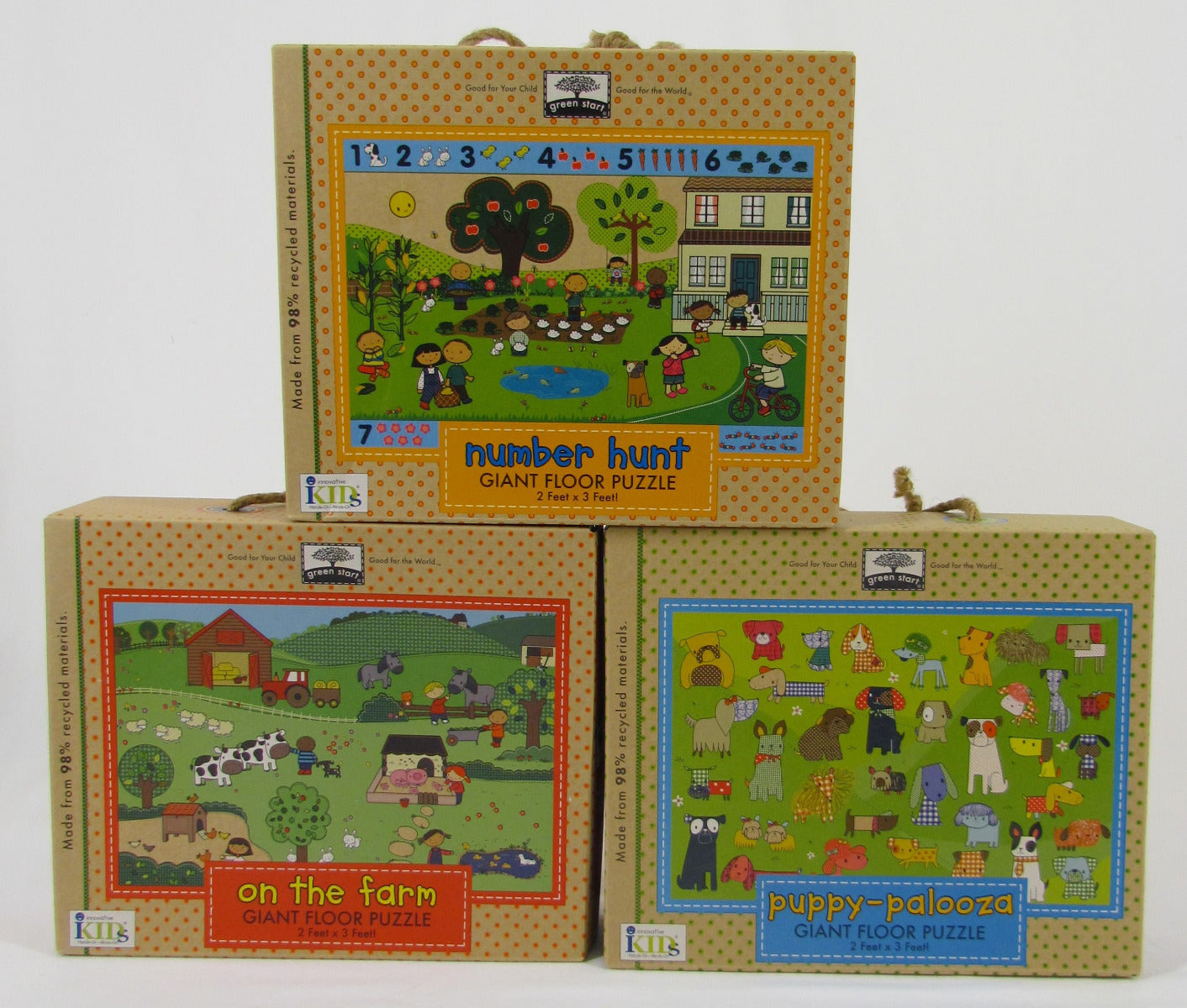 98% recycled materials, with eco-friendly inks, bringing your children earth-friendly messages and the joy of creating beautiful floor puzzles. Packaged in reusable totebox. Good for your child, Good for the World.