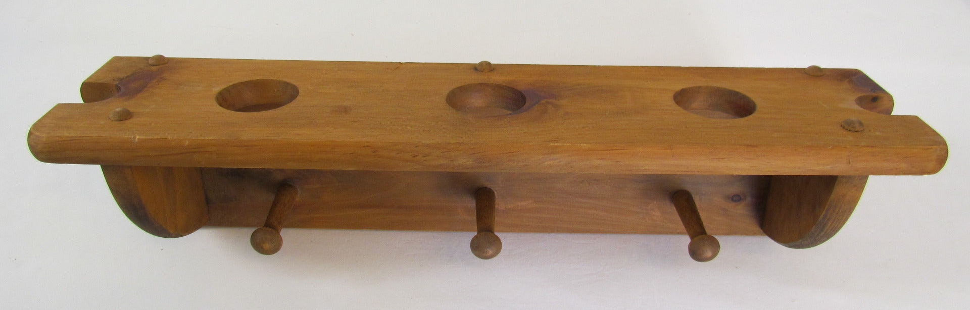 A place for everything and everything in it's place! This wonderful wall rack for baseball fans, designed and manufactured by Robbins Lumber in Maine from sustainable lumber, can store 3 baseballs, 2 bats and 3 baseball caps. Also room to hang bags and throw your gloves on the shelf.